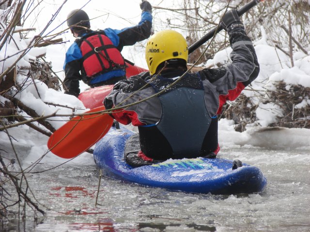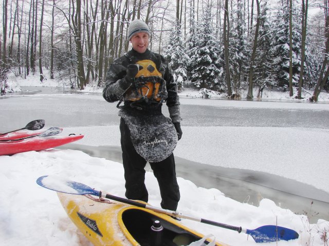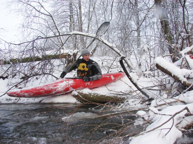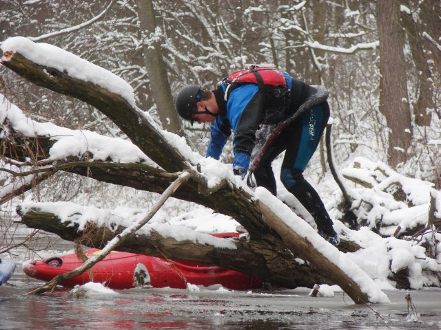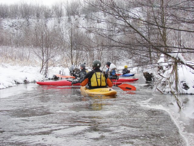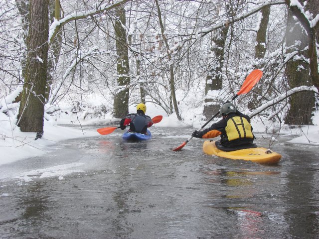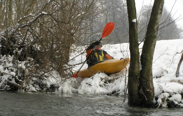 Kajakarstwo zwałkowe w zimowej scenerii.